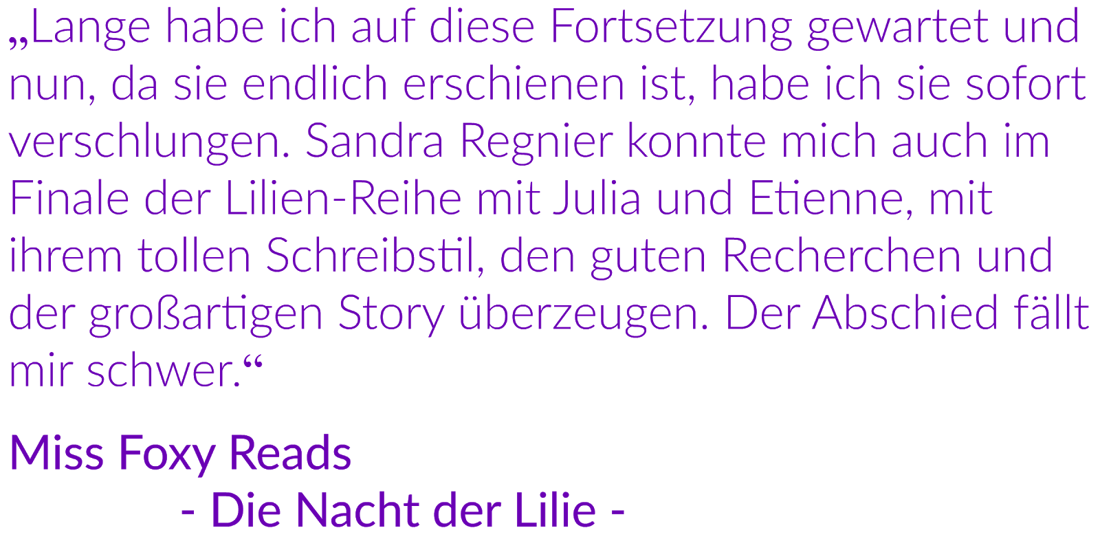„Das Herz der Lilie“ besticht mit einer zauberhaften Welt voller Intrigen, Geheimnissen, Freundschaft, Etikette und ganz großen Gefühlen. Leicht, dynamisch und absolut fantastisch erzählt Sandra Regnier die Geschichte von Julia und Etienne, die sich beide zusammen tun, Intrigen und Mordanschlägen entgehen und im Frankreich des 17. Jahrhunderts die große Liebe finden. Spannend, rasant und actiongeladen – ich konnte gar nicht mehr aufhören zu lesen.