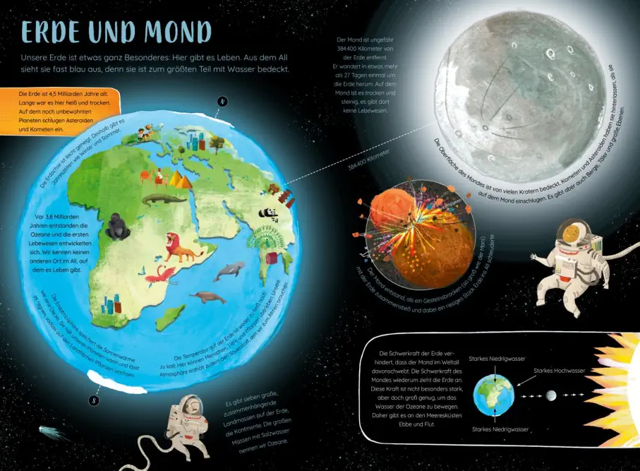 Das Universum ist riesig! Galaxien, Sterne, Planeten, Kometen und Asteroiden sind Teil davon – genau wie unsere Erde. Wie ist das Weltall entstanden und warum bewegen sich Monde und Planeten? Sterne werden geboren und irgendwann sterben sie – was passiert dabei? Was sind eigentlich Sternenbilder? Und wie gelingt es uns Menschen, den Weltraum zu erforschen?