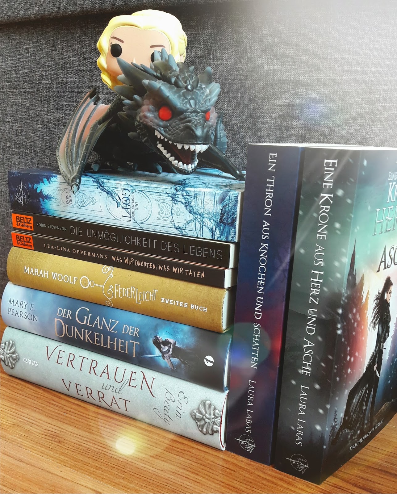 „Vertrauen und Verrat“ von Erin Beaty habe ich von der lieben Tanja Voosen zugeschickt bekommen (noch mals vielen lieben Dank) und ich bin schon total gespannt auf das Buch. Ich habe schon viel Gutes, aber auch viel Schlechtes über das Buch gehört und gerade das macht mich so neugierg darauf! Der Glanz der Dunkleheit von Mary E. Pearson war ein absoluter Wunschtitel und wurde bereits verschlungen. Das Finale hat mir wahnsinnig gut gefallen und ich bin schon ein bisschen traurig, dass die Reihe jetzt zu Ende ist. Auch der 2. Band der „FederLeicht-Saga“ von Marah Woolf ist bereits bei mir eingezigen und wartet darauf, ganz bald gelesen zu werden!