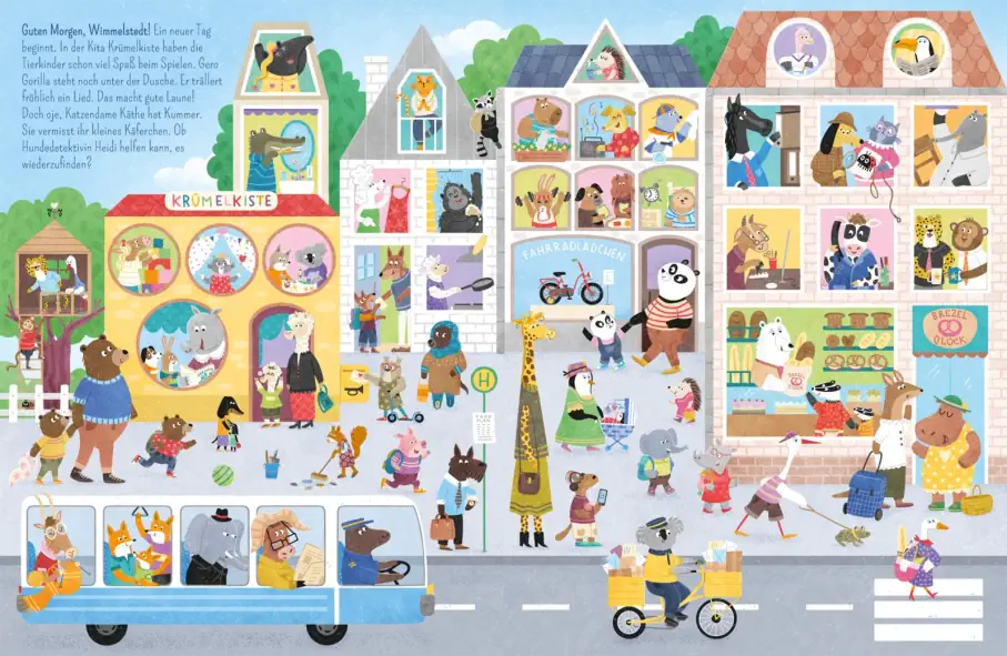 Willkommen in Wimmelstedt, der fröhlichen Tierstadt voller Alltagsabenteuer! Hier gibt es auf jeder Seite neue Geschichten zu entdecken: Kuno Krokodil putzt fleißig Zähne, auf dem Marktplatz verkauft Shaya Schaf leckere Baklava an Danny Dackel. Und vor dem Hotel am Markt wird gefeiert – aber was ist der Anlass?