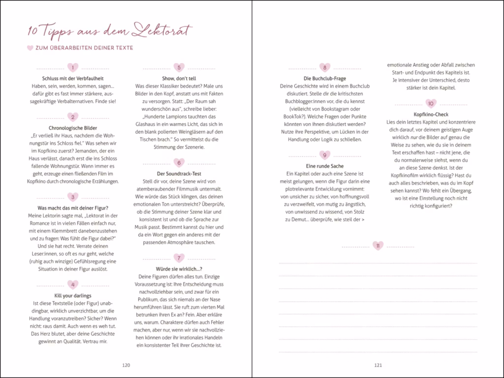 Sehr positiv hervorheben möchte ich zudem das Kapitel rund um „Spice“ und romantische Spannung. Hier wird sensibel und gleichzeitig ehrlich erklärt, wie man sinnliche Szenen schreibt, ohne dass sie ihre emotionale Wirkung verlieren. Der Fokus auf Tension und Gefühl macht dieses Buch besonders wertvoll für Romance-Autor*innen.